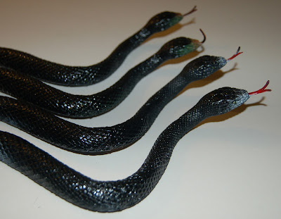 I sprayed both the snakes and the wreath (in my enthusiasm to get cracking, I forgot to take any photos before spraying - 2 of the snakes were green and the other 2 were black with a white stripe) and left them to dry all day. I hung the wreath on some string on the washing line and left the snakes flat.